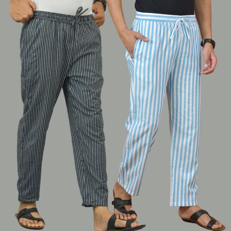 Combo of 2 Men Navy Blue Cyan Cotton Handloom Stripe Pant-15660
