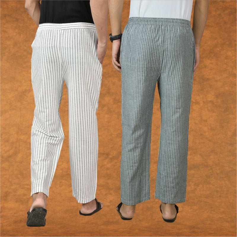 Combo of 2 Men White Gray Cotton Handloom Stripe Pant-15110