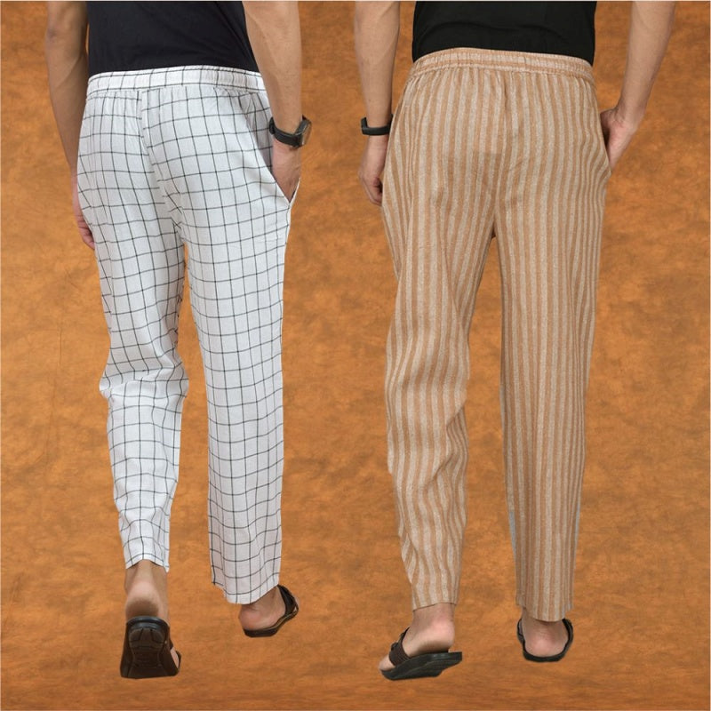 Combo of 2 Men Beige White Cotton Handloom Stripe Pant-15077