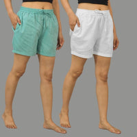 Combo of 2 White and Cyan Cotton Women Shorts-10553