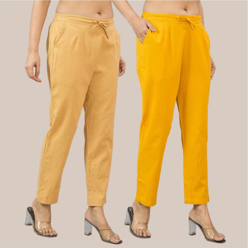 Combo of 2 Yellow and Beige Cotton Flax Women Trouser Pant-10325