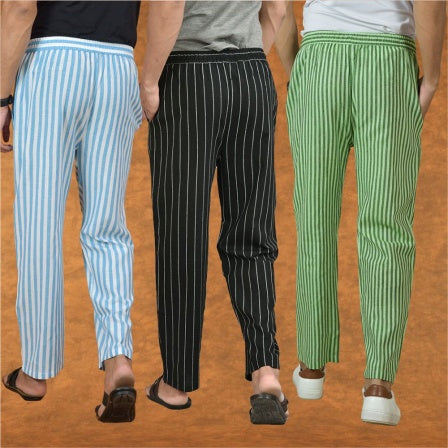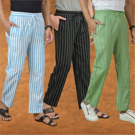 Inform when this item available COMBO OF 3 MEN STRIPE COTTON HANDLOOM PANT BLACK OLIVE GREEN AND SKY BLUE-15161