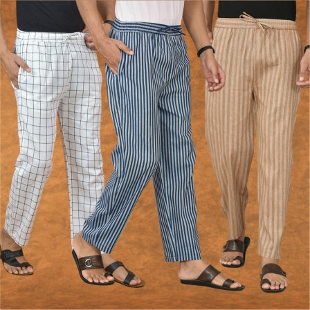 Inform when this item available COMBO OF 3 MEN STRIPE COTTON HANDLOOM PANT BLUE BEIGE AND WHITE-15312
