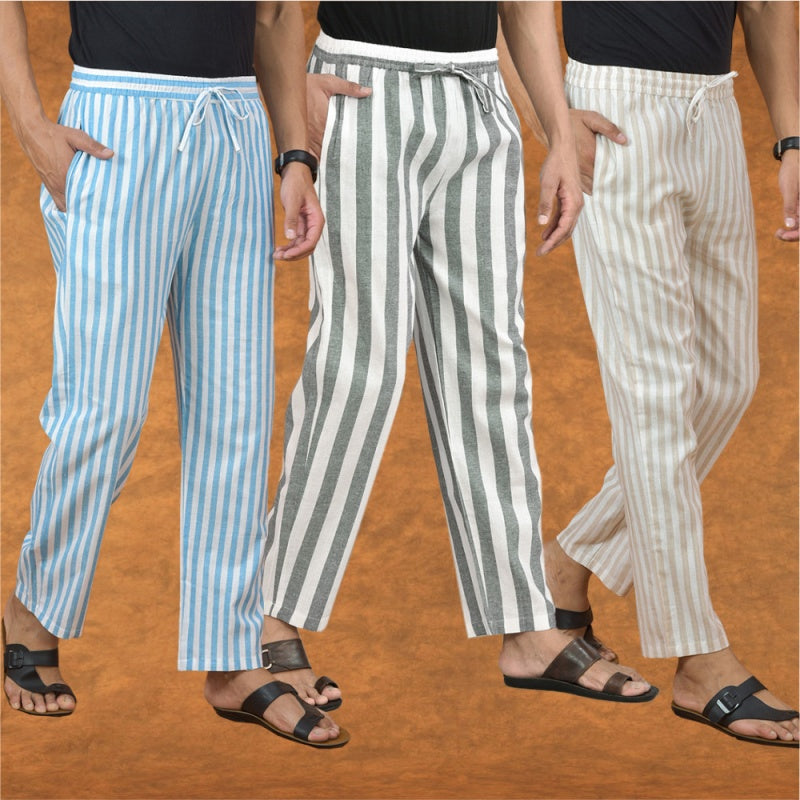 Inform when this item available COMBO OF 3 MEN STRIPE COTTON HANDLOOM PANT GRAY BEIGE AND SKY BLUE-15154