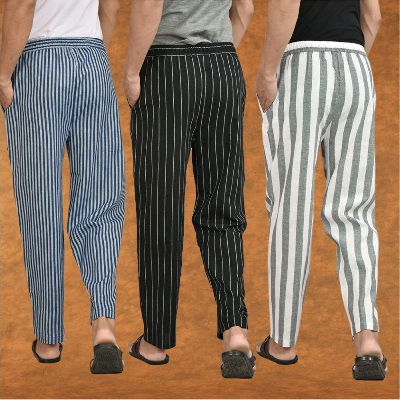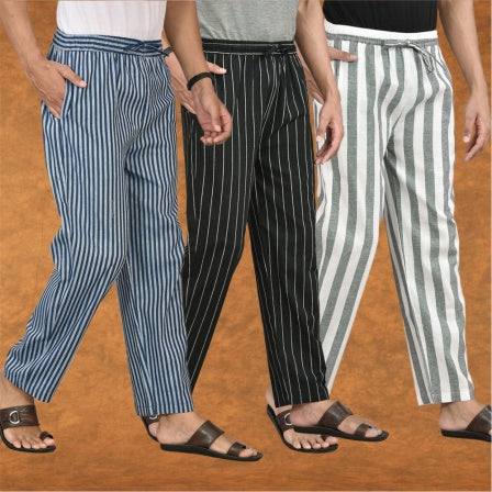 COMBO OF 3 MEN STRIPE COTTON HANDLOOM PANT GRAY BLACK AND BLUE-15484