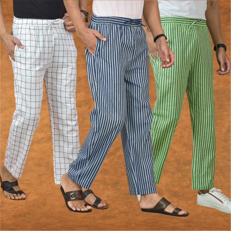 Inform when this item available COMBO OF 3 MEN STRIPE COTTON HANDLOOM PANT BLUE OLIVE GREEN AND WHITE-15282