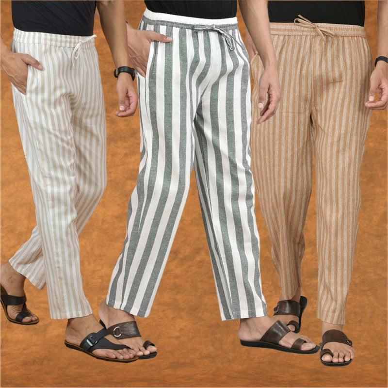 Inform when this item available COMBO OF 3 MEN STRIPE COTTON HANDLOOM PANT GRAY BEIGE AND BEIGE-15360