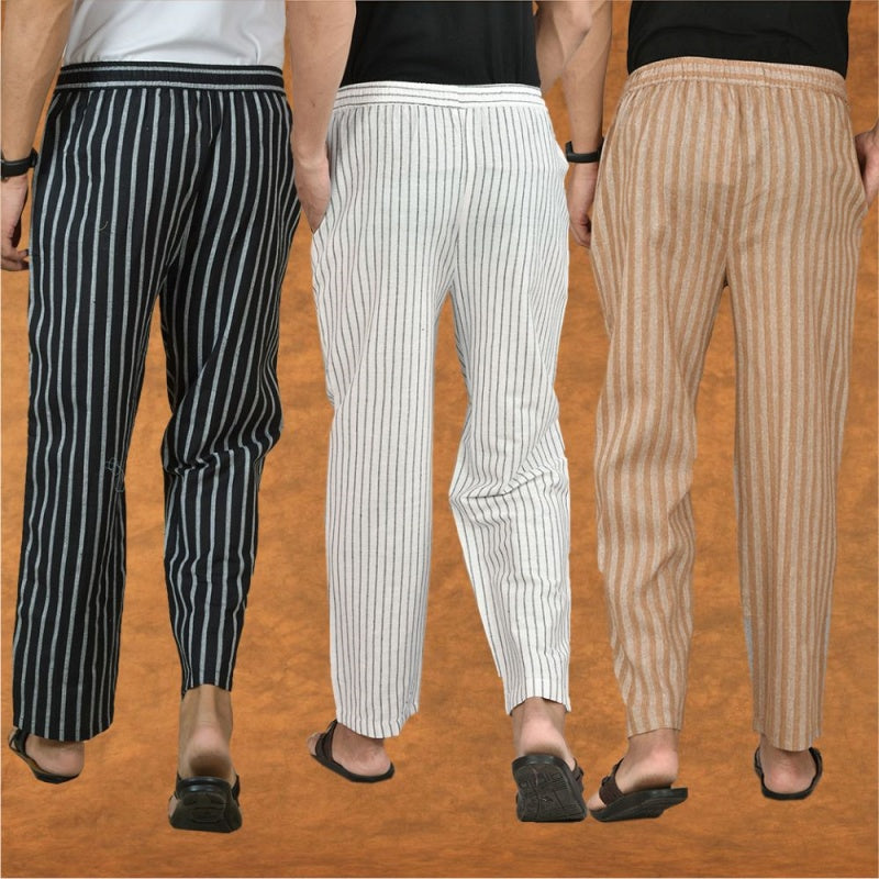 Inform when this item available COMBO OF 3 MEN STRIPE COTTON HANDLOOM PANT WHITE BEIGE AND BLACK-15444