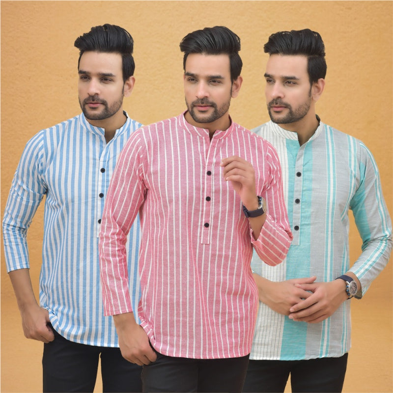 Combo of 3 Men Kurtas Stripe Cotton Handloom Pink Green and Sky Blue-25119