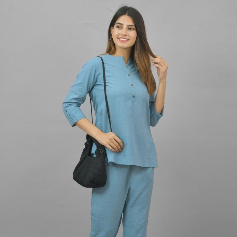Inform when this item available Women Co-Ords Sky Blue Cotton Flax Dress Top and Bottom