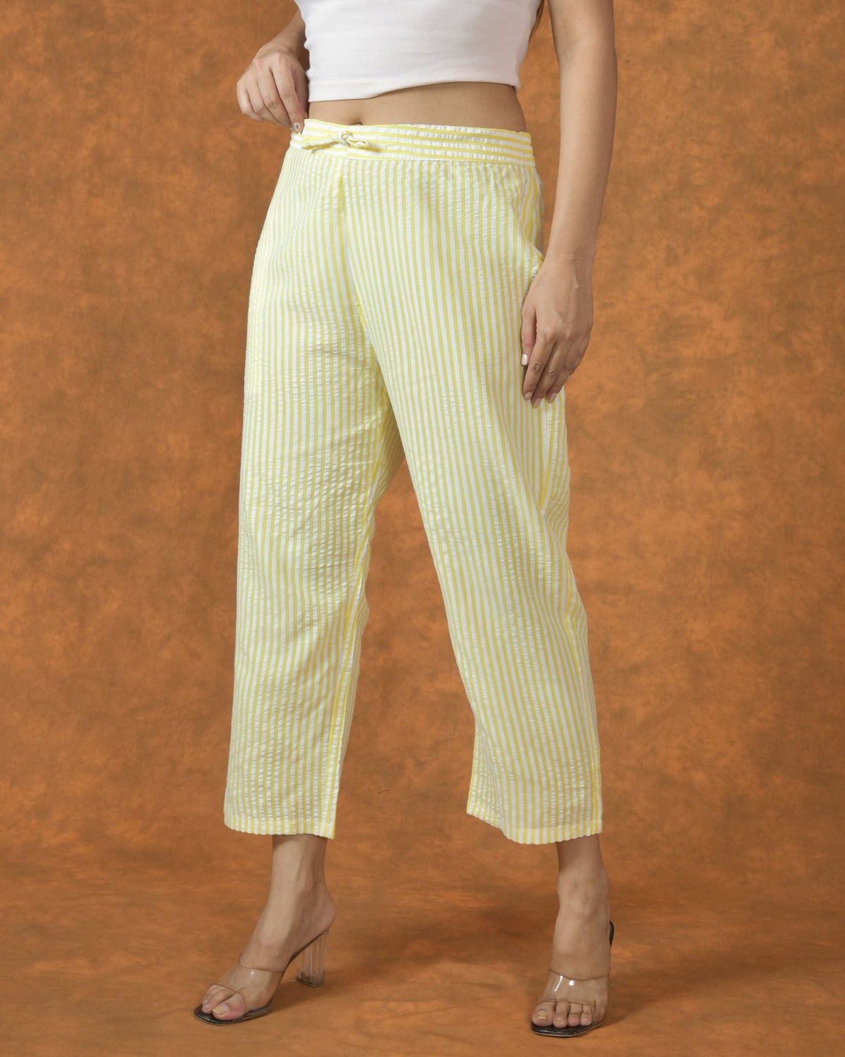 White Yellow Cotton Stripe Regular Pant - S-(28 Inches)